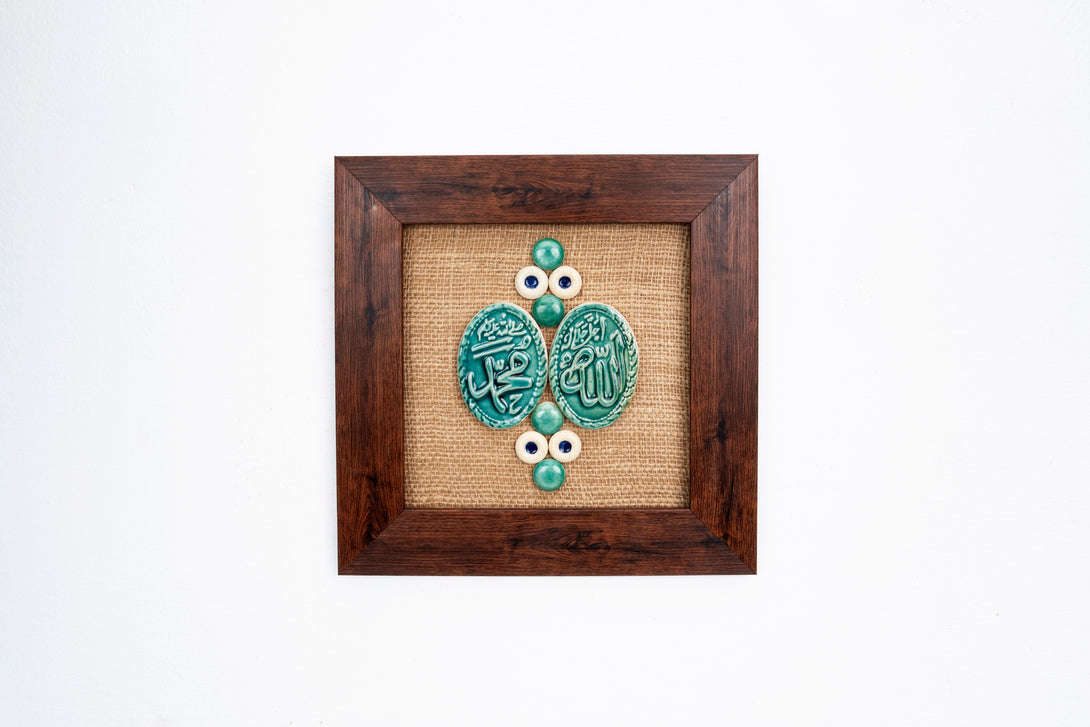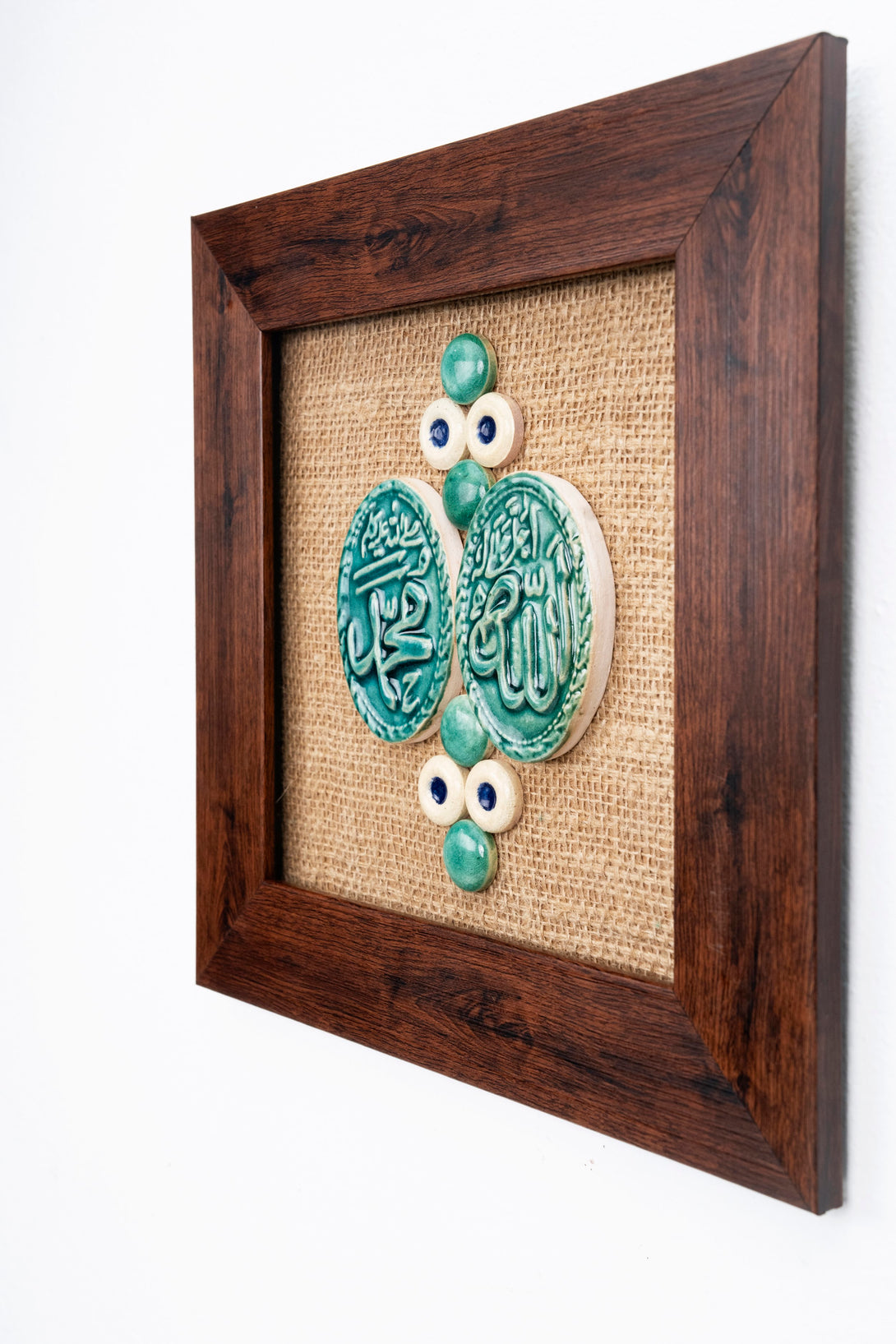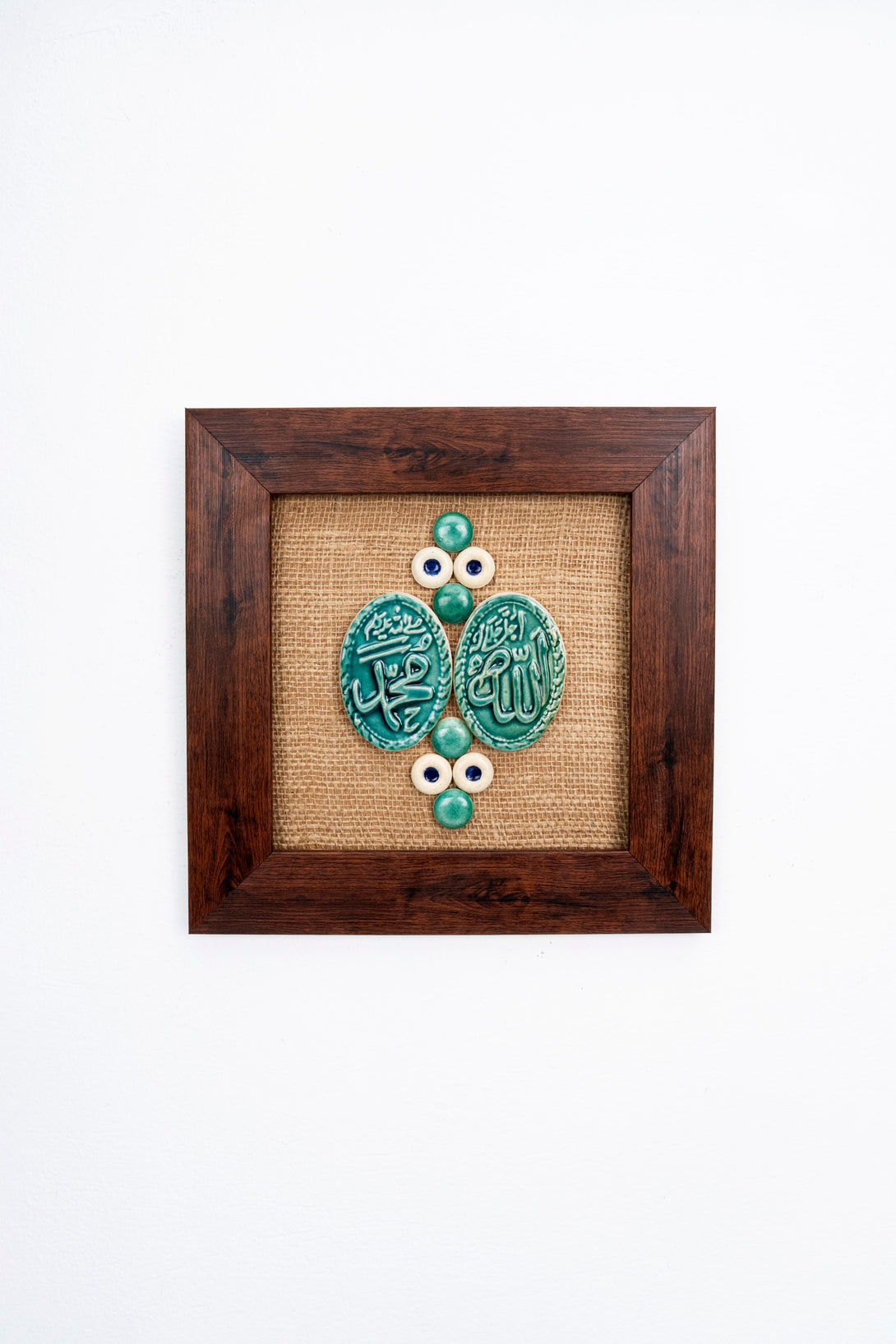Featuring a natural jute background framed in rich wood, this artwork showcases intricately crafted ceramic shapes joined together to form a beautiful, eye-catching design. The combination of earthy textures