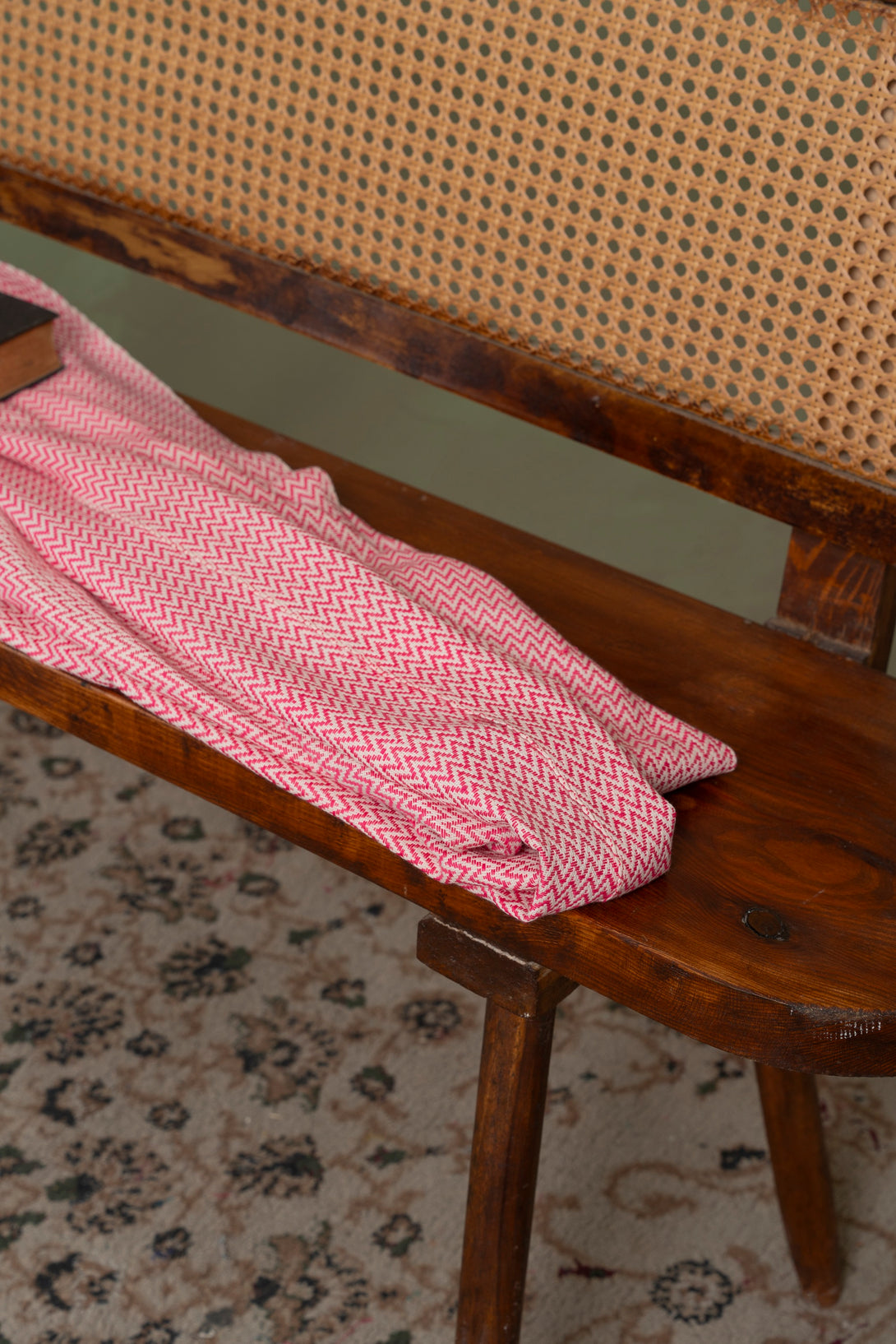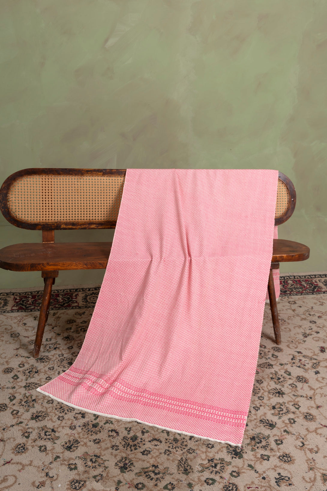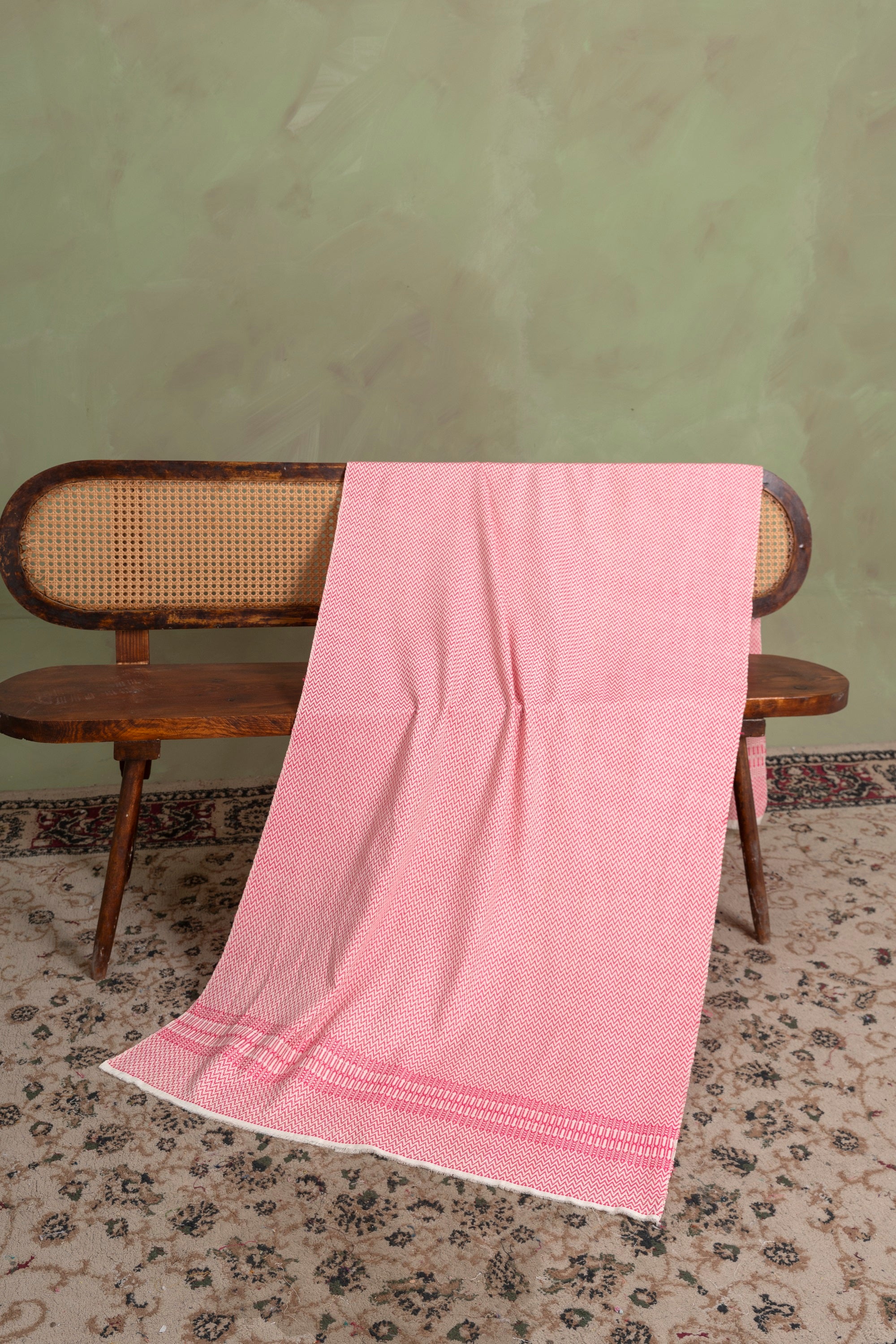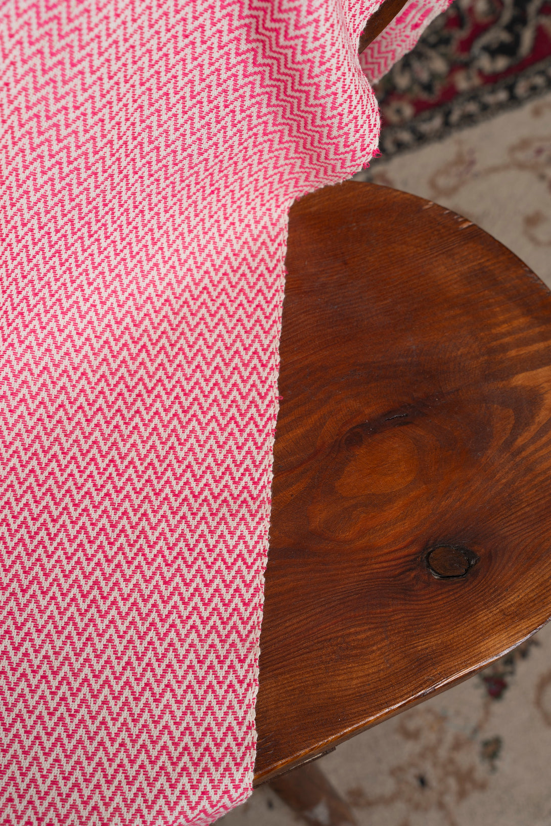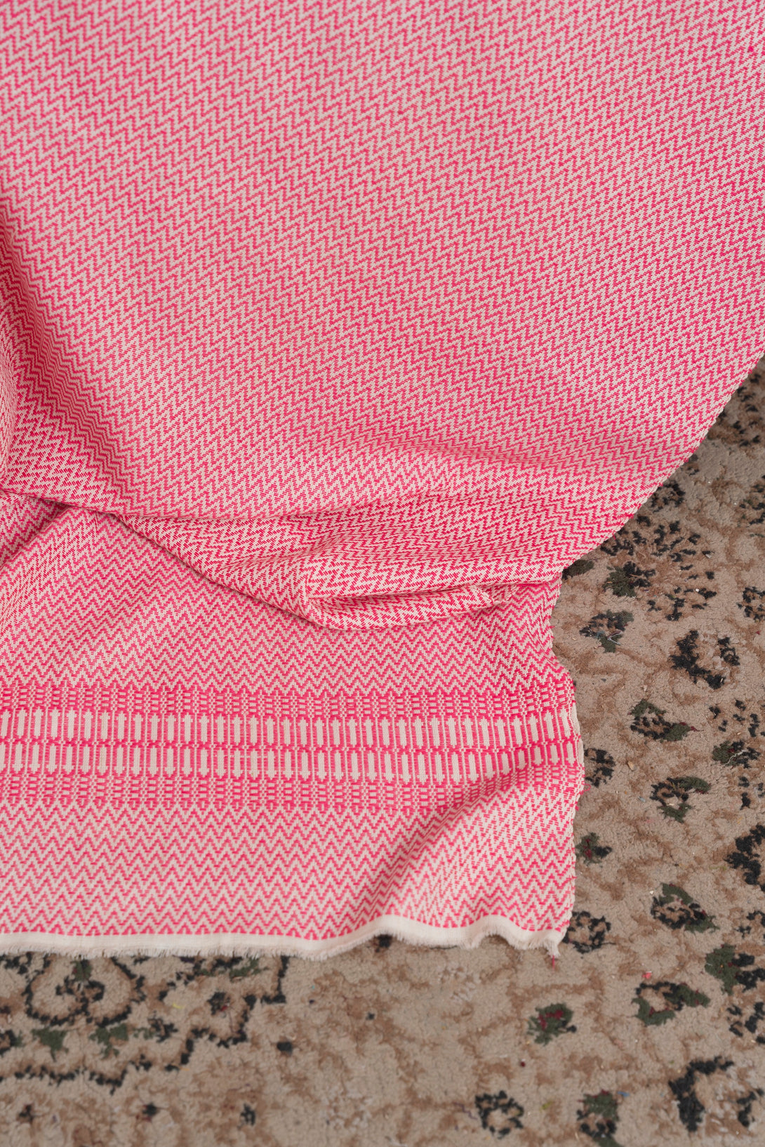 This charming pink and cream herringbone-patterned khais features a cozy blend of soft hues and textured weave, creating a warm and inviting aesthetic. The subtle interplay of pink and cream tones in a classic herringbone design adds a touch of timeless elegance, making it a lovely addition to any home decor for snuggling up or adding a decorative layer. The khais appears to be made of a woven fabric, likely cotton or a cotton blend, with a visible texture that enhances its tactile appeal.