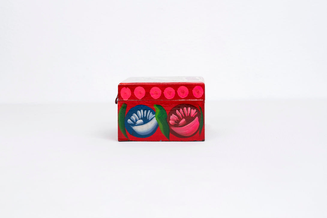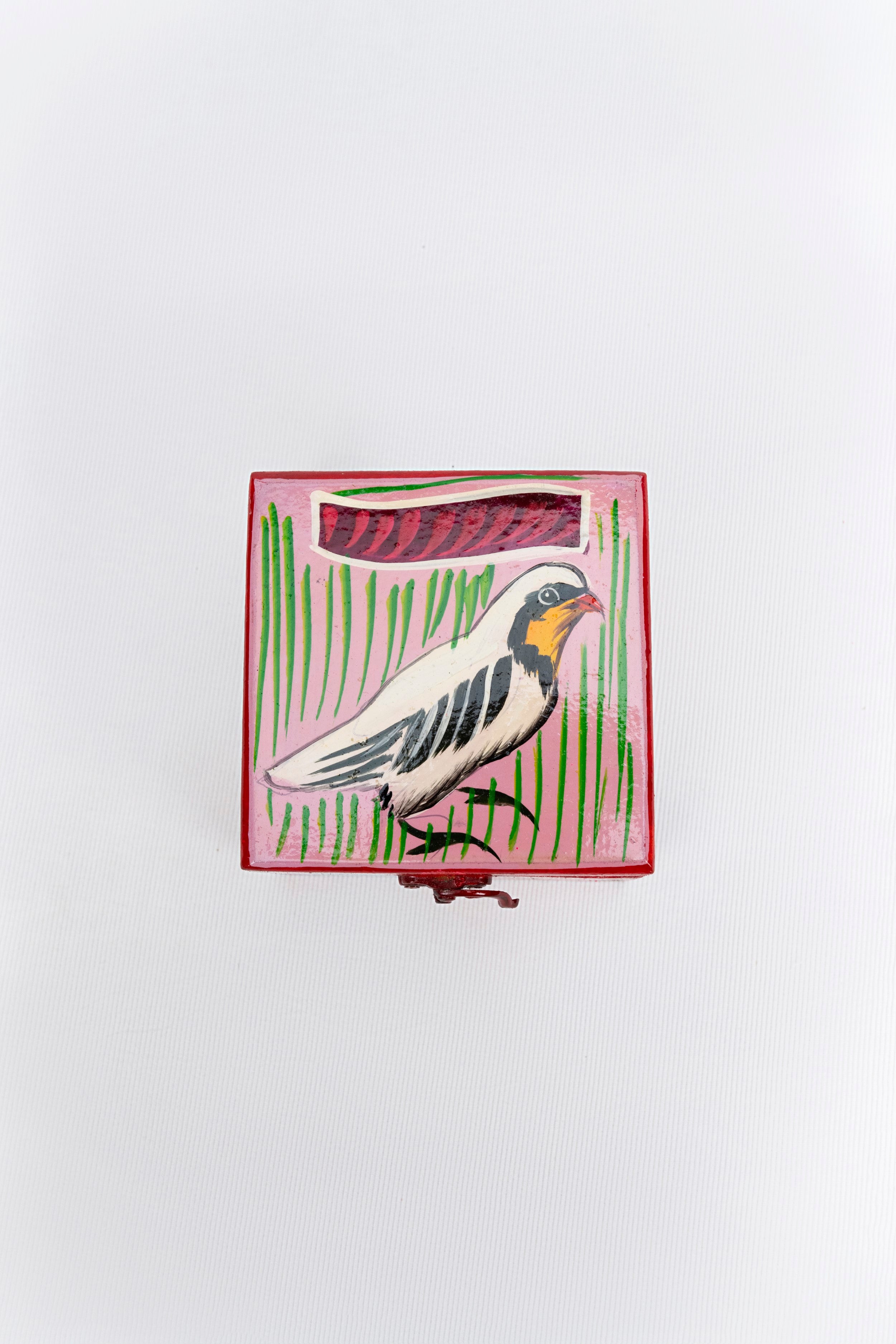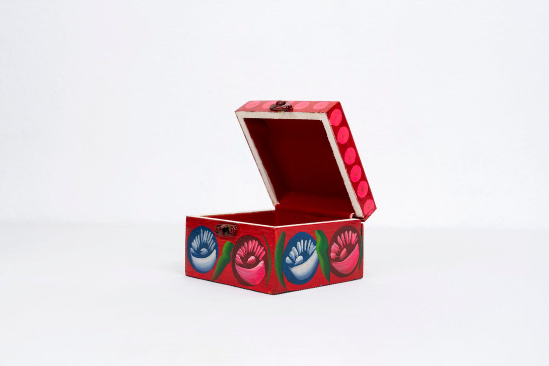 Keep your precious trinkets safe in this charming hand-painted wooden box. Featuring a vibrant red base adorned with a delightful white and black bird on top, surrounded by playful pink and blue accents, this box is a true work of art. Its unique design and intricate details make it a lovely decorative piece for any dresser, desk, or shelf, adding a touch of traditional artistry to your home.