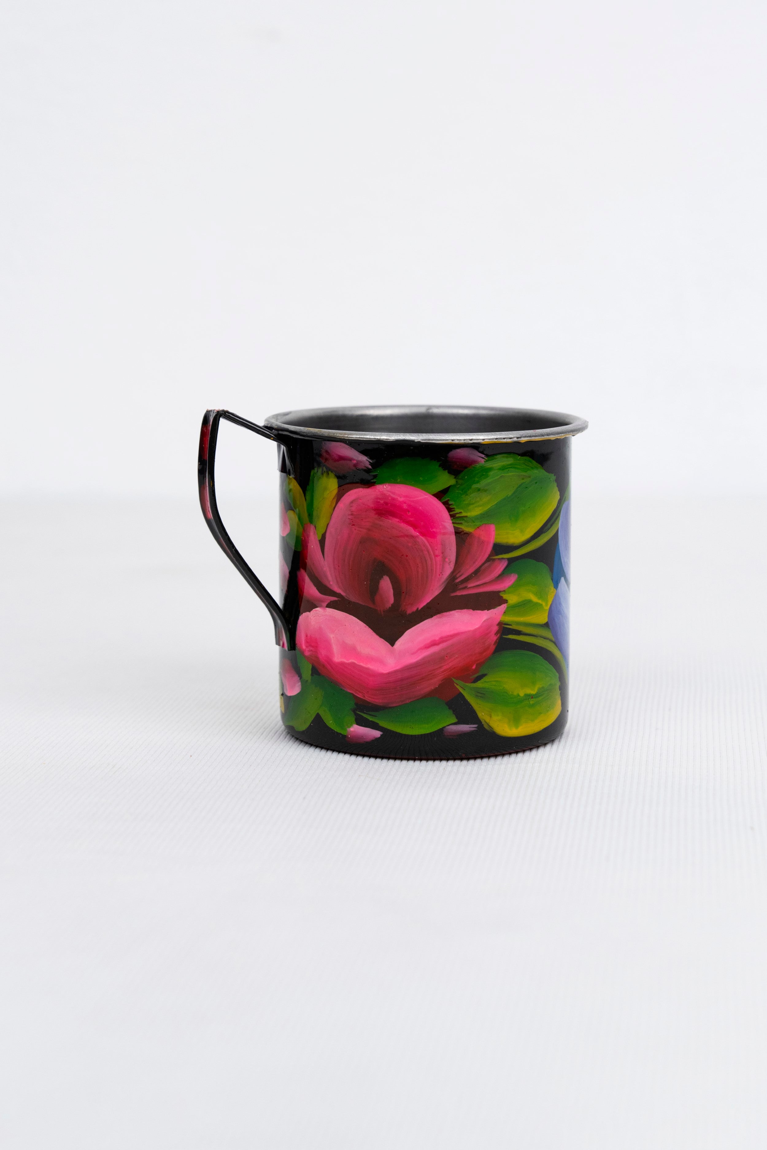 Add a touch of vibrant artistry to your space with our charming Hand-Painted Floral Mini Mug. This delightful mug features a bold and beautiful hand-painted rose design in shades of pink and green against a dark background, making it a perfect decorative accent for any desk, shelf, or kitchen. Each piece is lovingly crafted and painted by hand, showcasing unique brushstrokes and an authentic artistic flair. It's an ideal gift for art lovers or anyone looking to infuse their home with color and character.