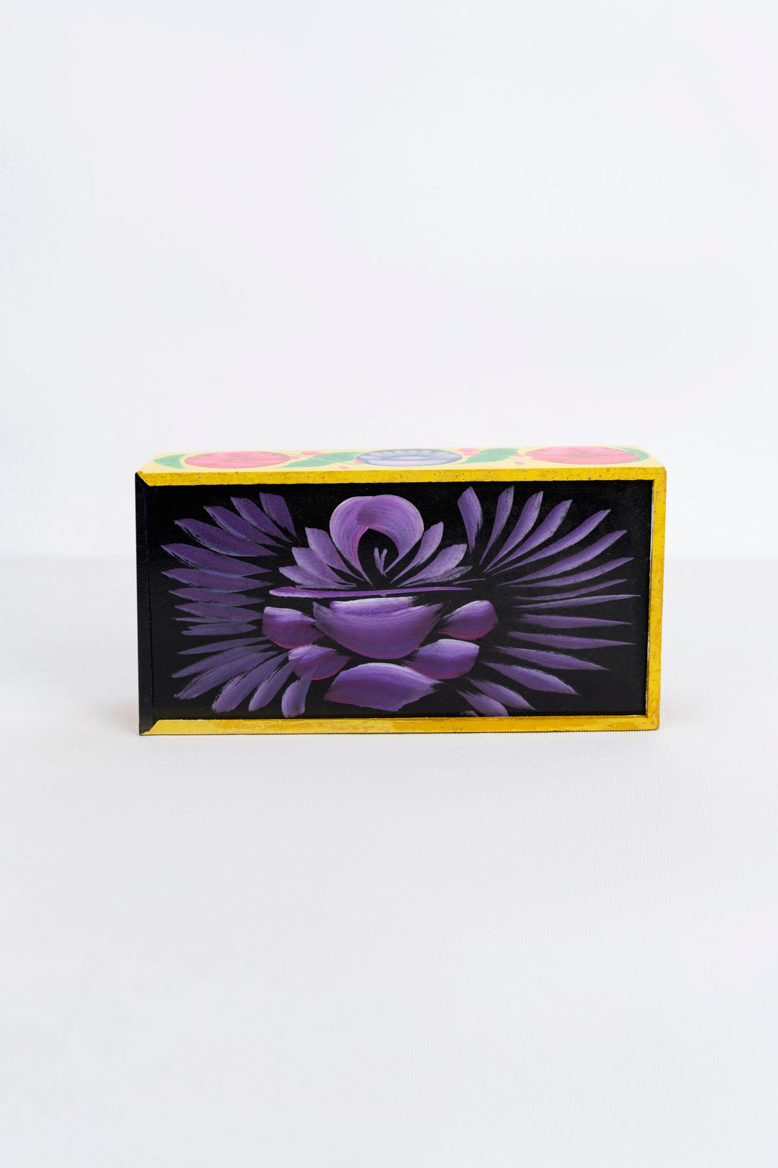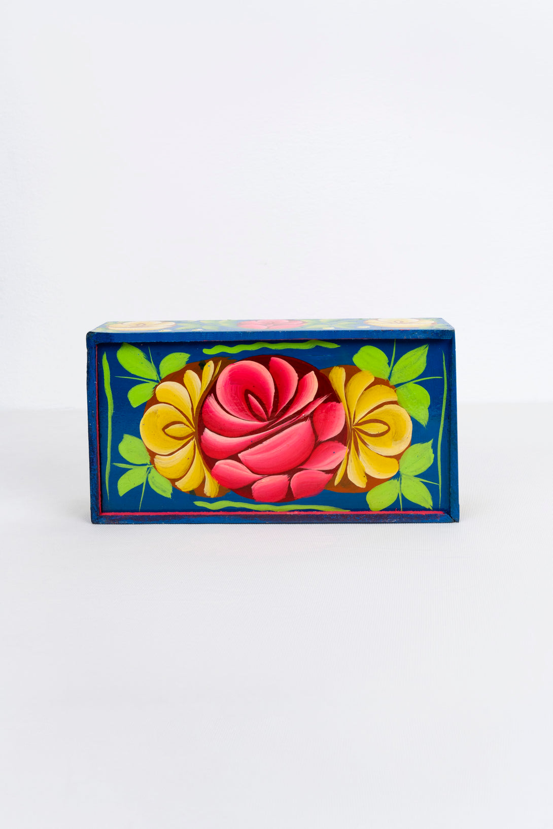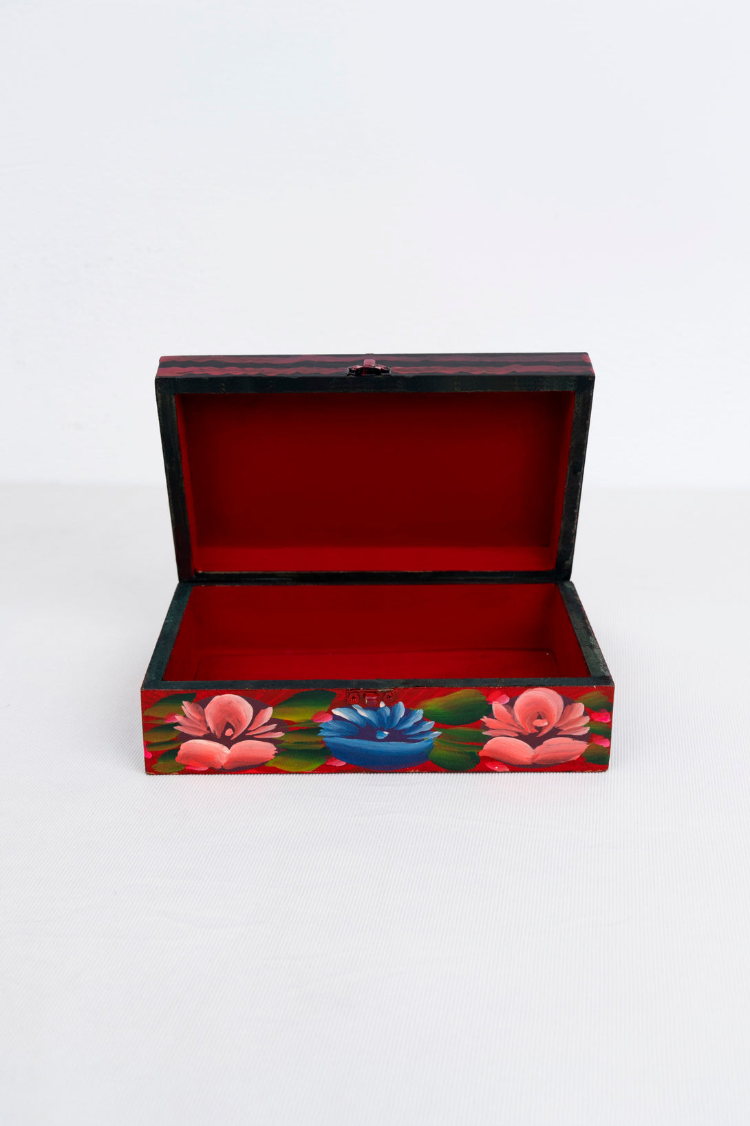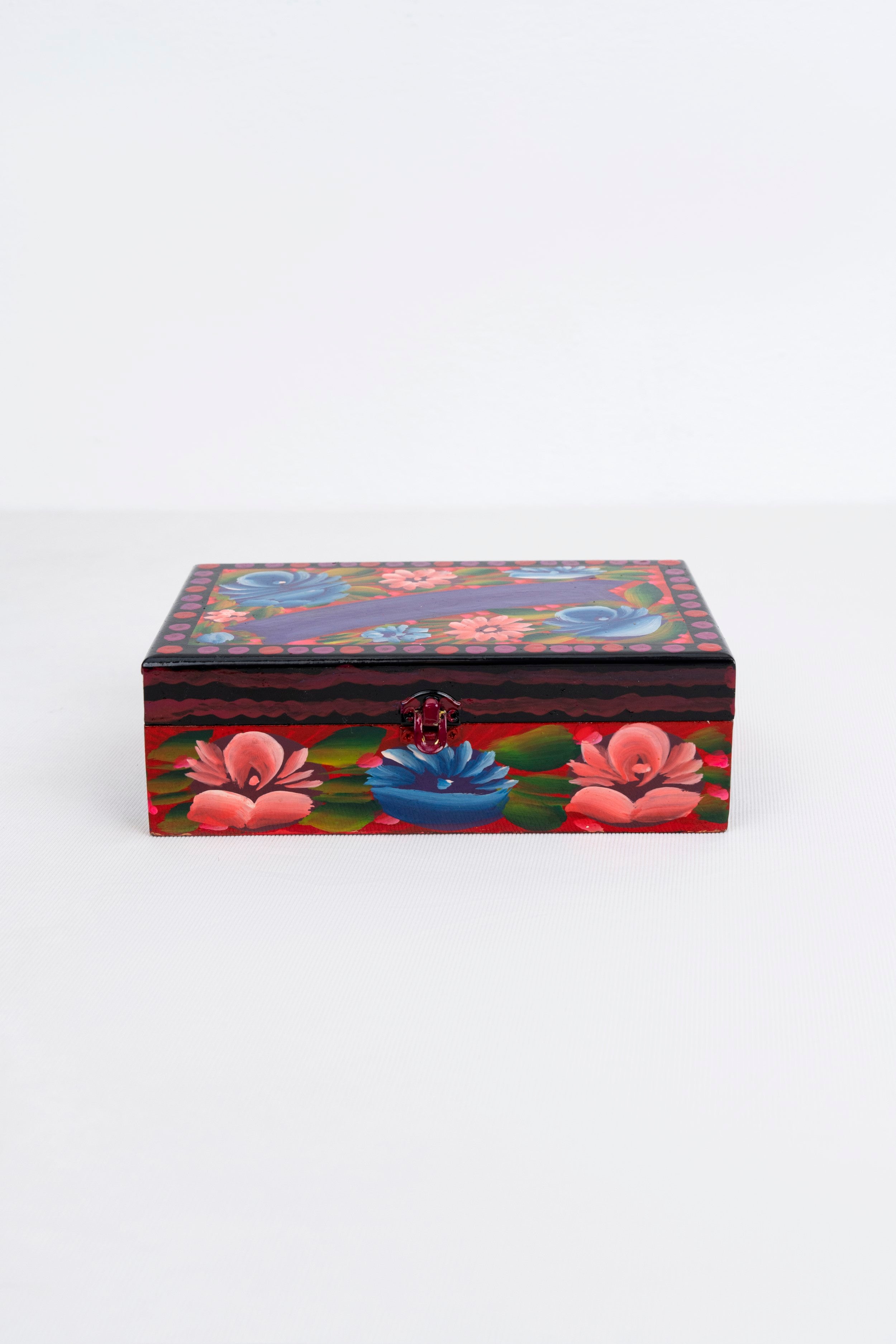 Store your treasures in this beautifully hand-painted wooden box, featuring a captivating blend of blue, pink, and red floral designs with intricate patterns. This elegant piece showcases traditional artistry, perfect for adding a pop of color and cultural charm to any room. Its unique design makes it an ideal decorative accent or a thoughtful gift.