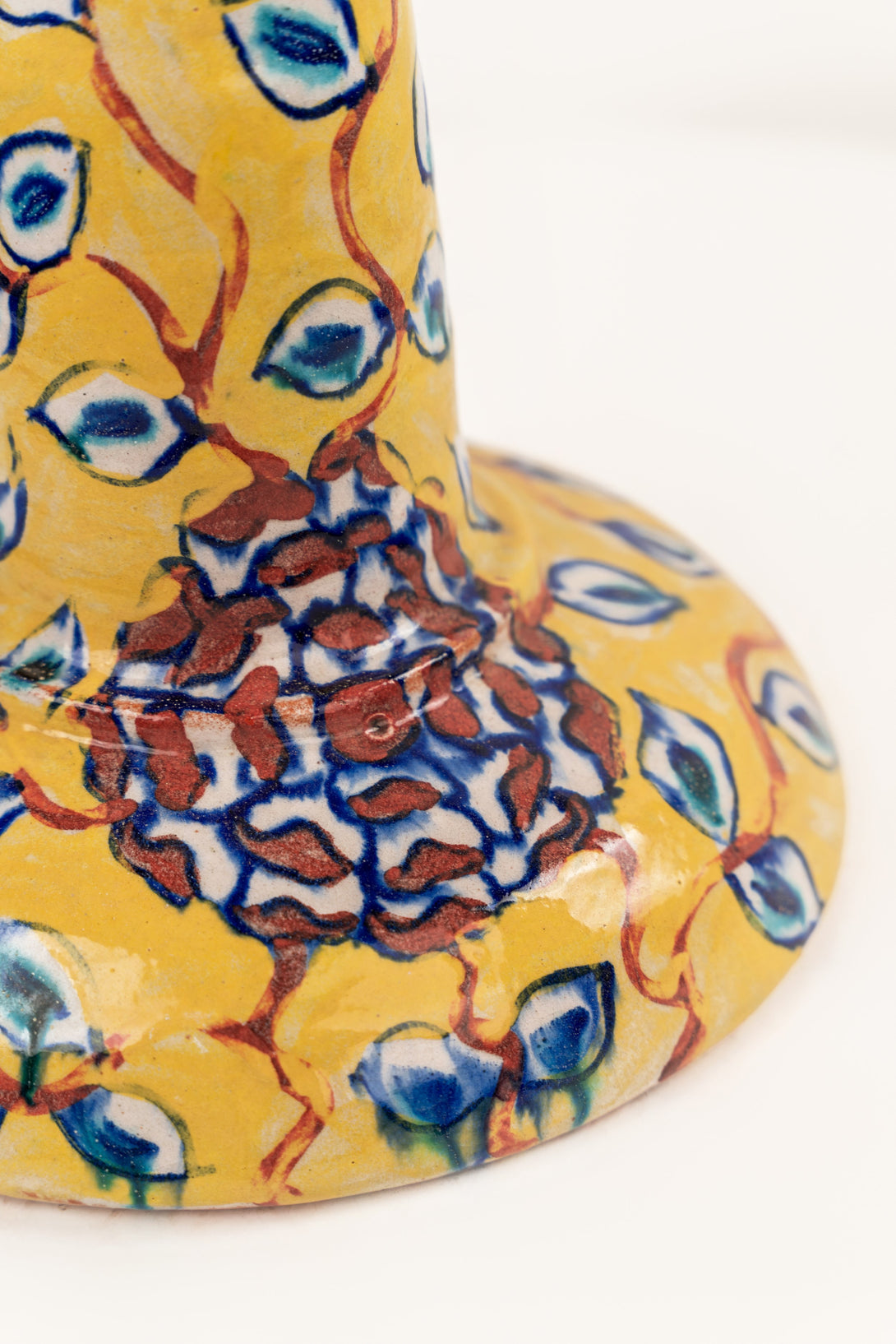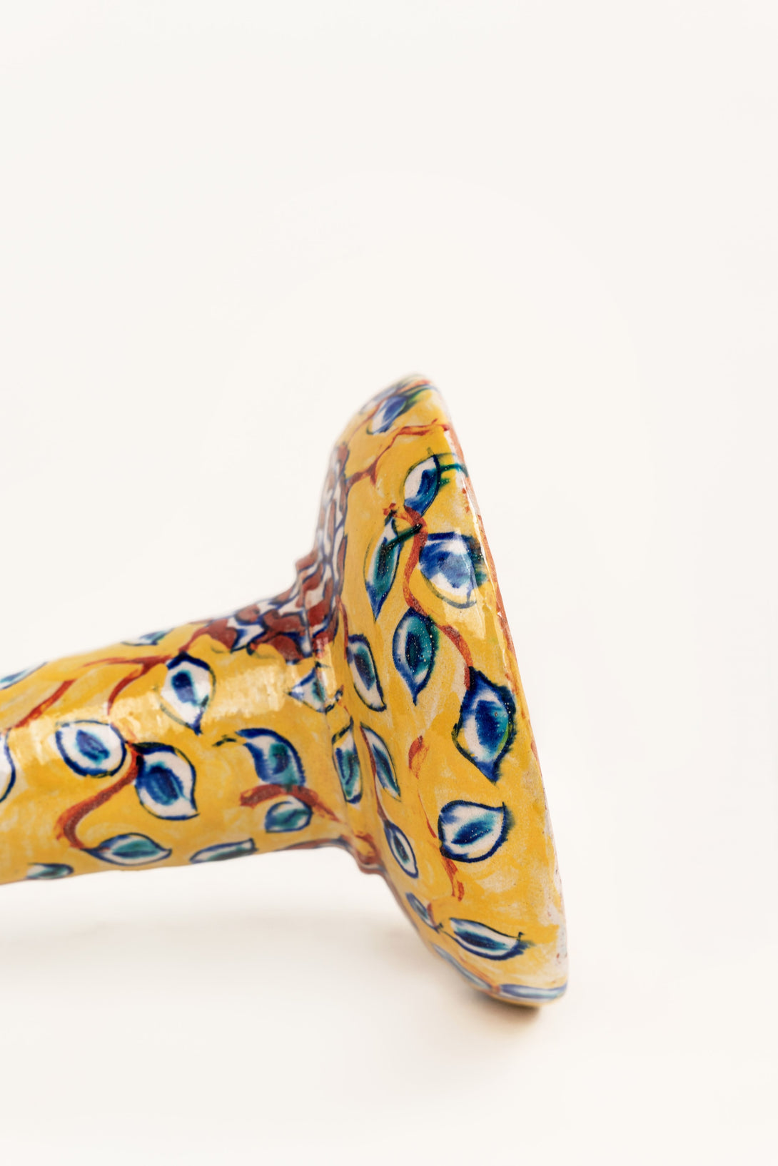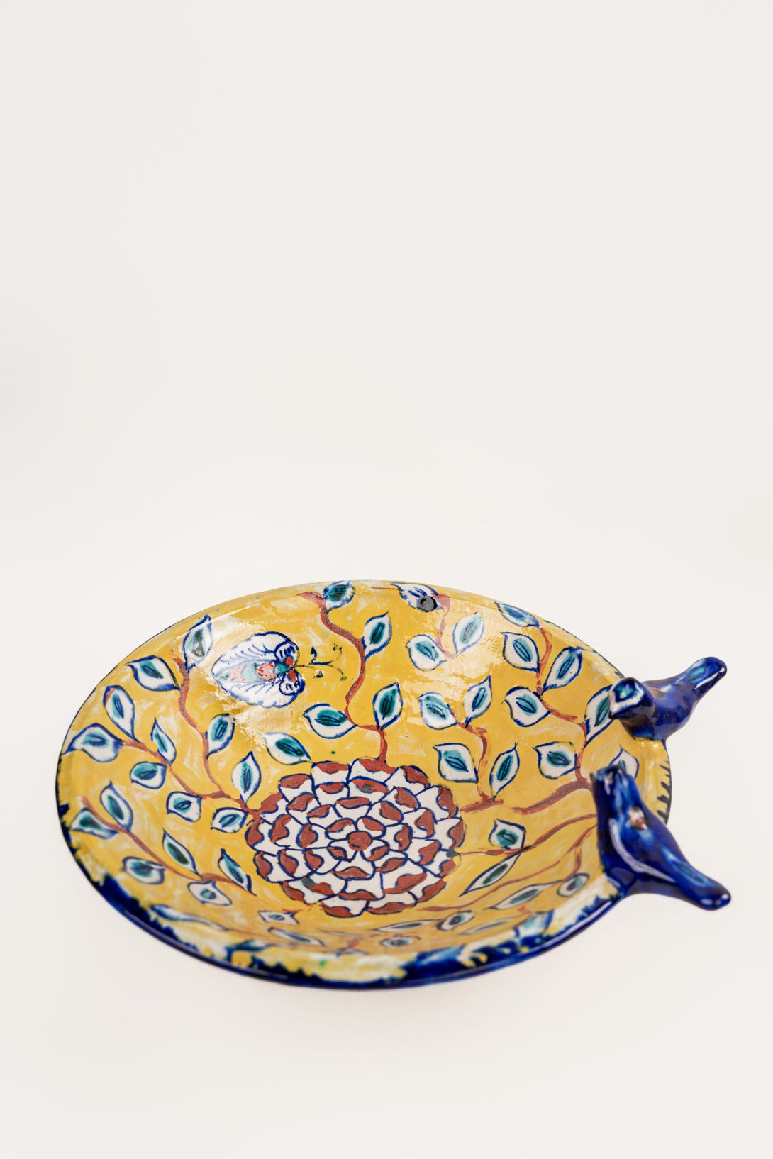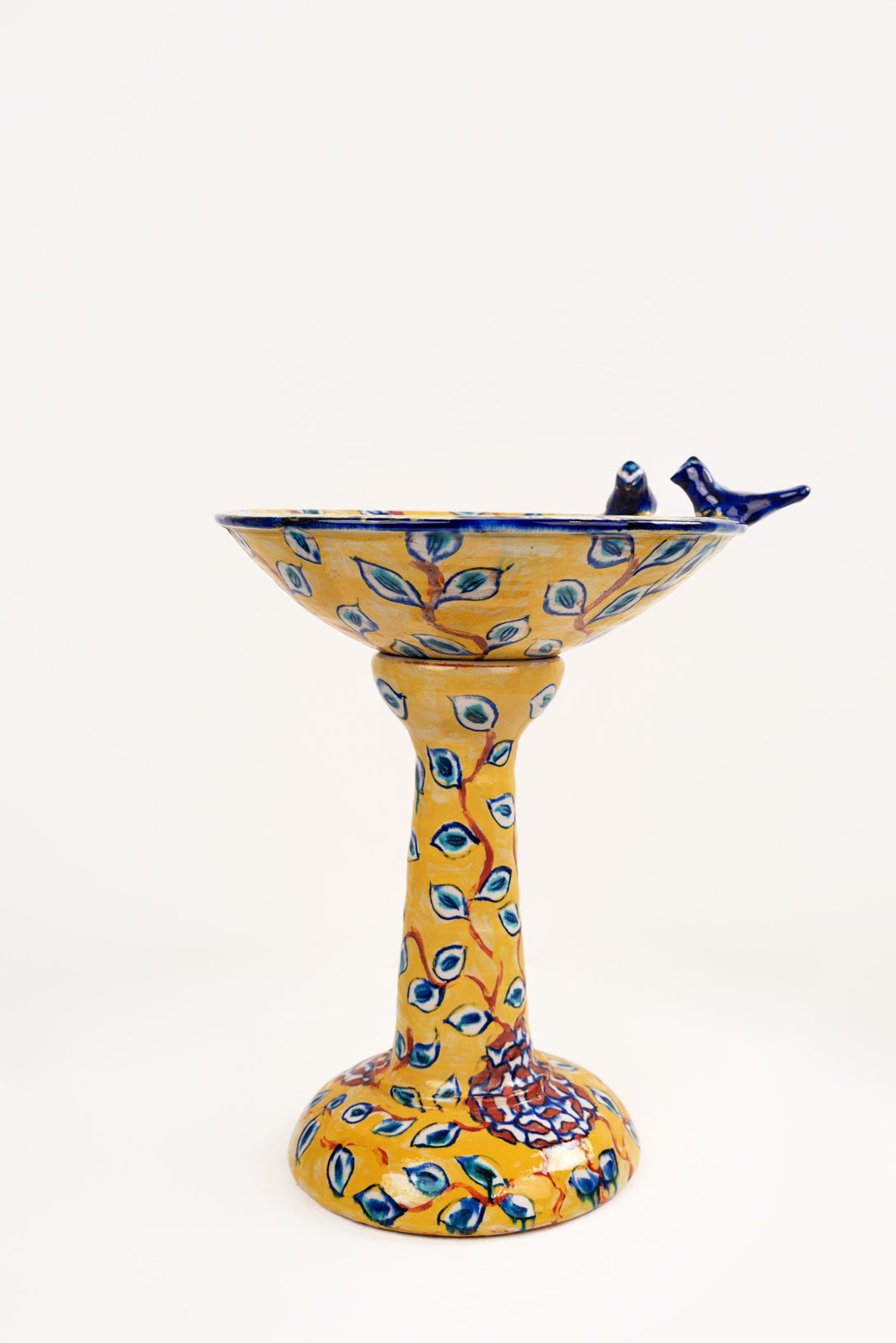 These captivating footed bowls are meticulously hand-painted by skilled artisans in Lahore, each piece radiating vibrant colors and intricate designs inspired by nature. Crowned with charming hand-sculpted birds perched on the rim, these bowls serve as elegant decorative accents, unique display pieces for floating candles or collectibles, or inviting bird baths for your garden or indoor spaces.