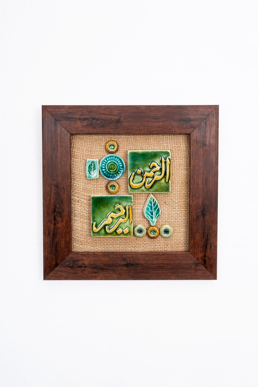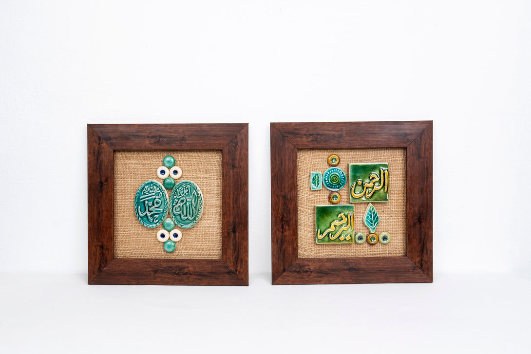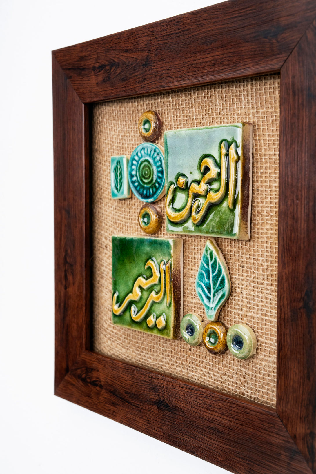 Featuring a natural jute background framed in rich wood, this artwork showcases intricately crafted ceramic shapes joined together to form a beautiful, eye-catching design. The combination of earthy textures and artistic detailing makes it a perfect statement piece for any wall, blending rustic charm with timeless elegance