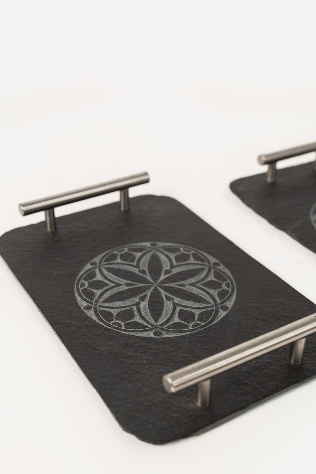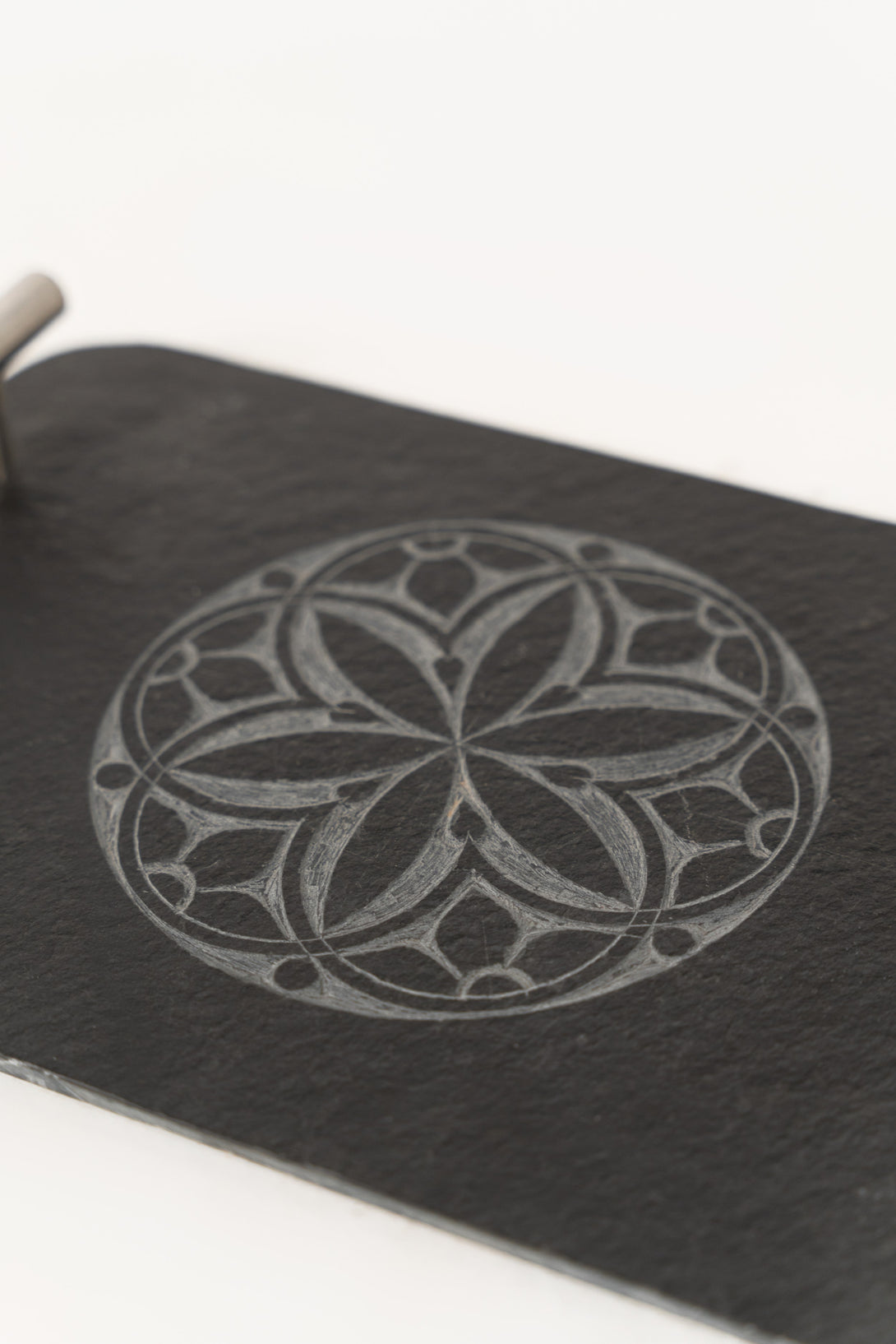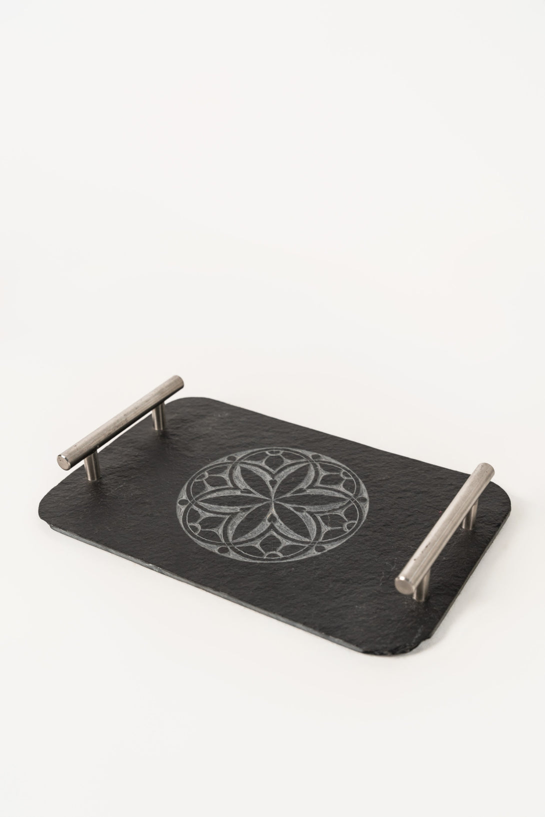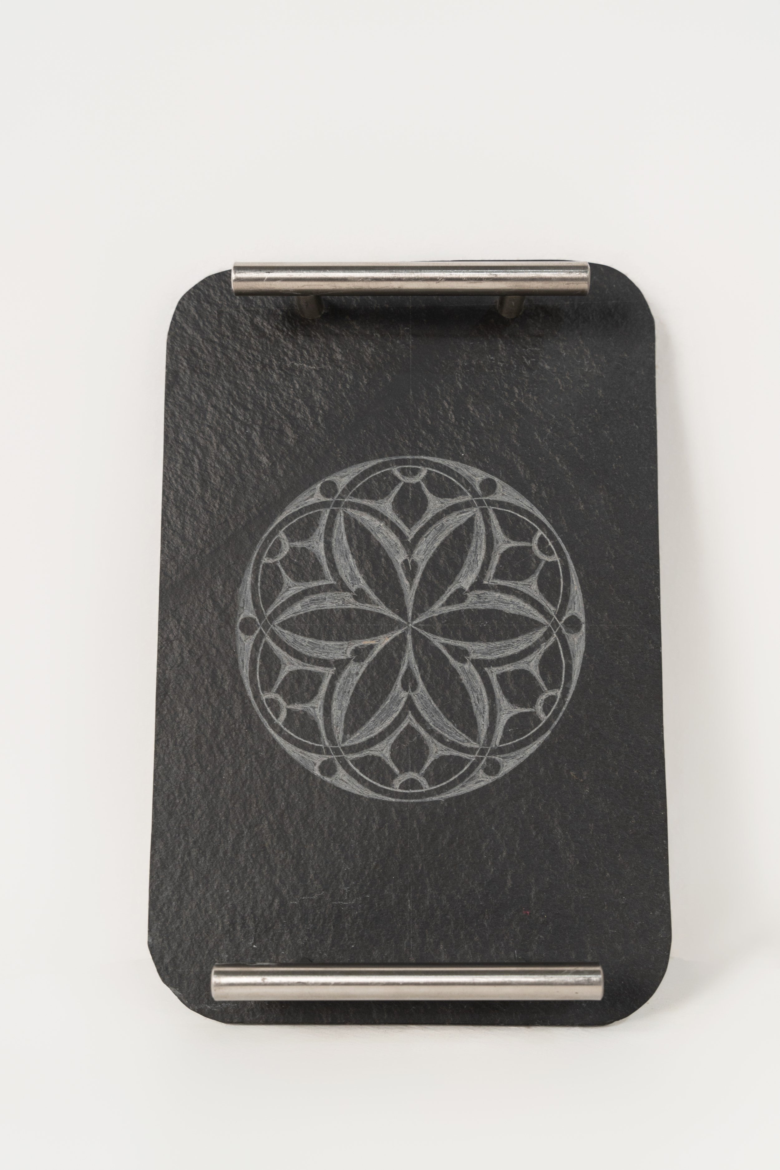 This charming decorative piece features a slate surface with an intricately etched design of a circular floral pattern. Metal handles add a sleek, modern touch, while the etched motif brings a touch of natural elegance. The contrast between the dark slate and the etched design creates a sophisticated ambiance, making it a lovely statement piece for any home or office setting.