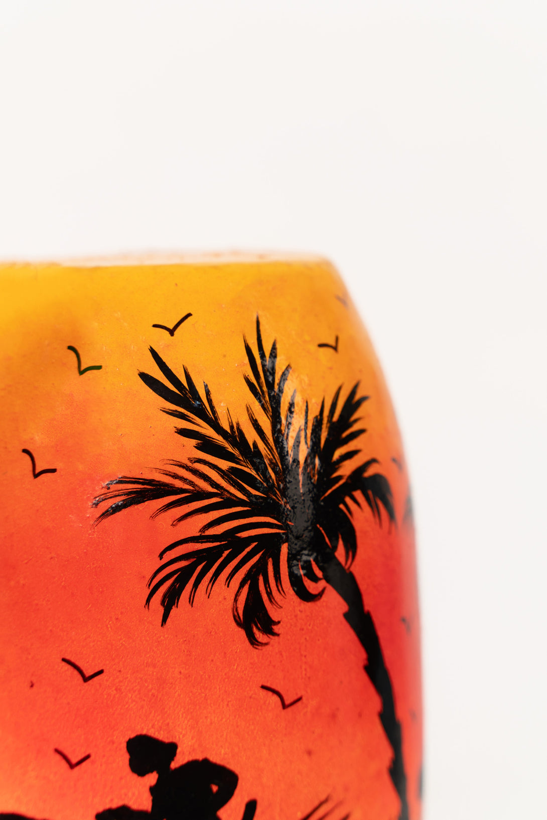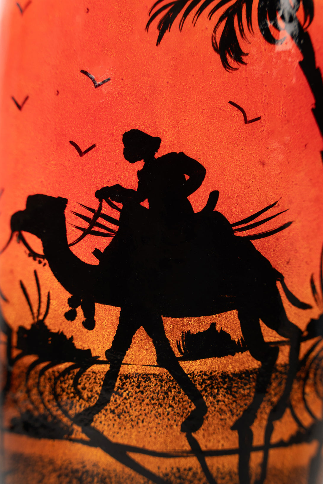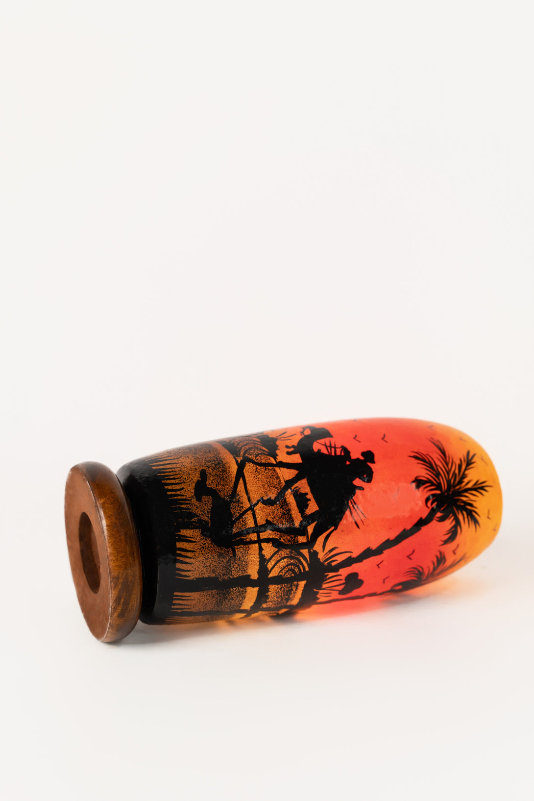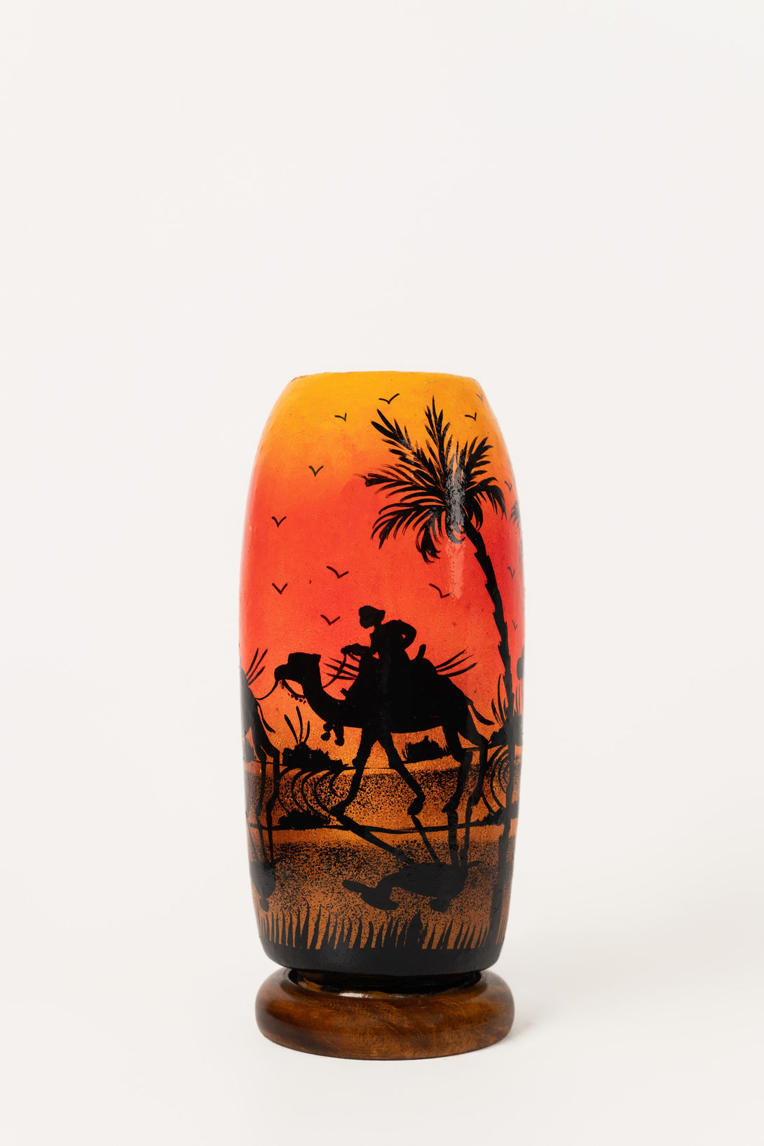 This stunning ceramic vase showcases a captivating desert scene, featuring a silhouette of a person riding a camel under a palm tree against a vibrant orange and yellow gradient background. The intricate design is accentuated by the glossy finish, adding a touch of elegance to any room. The vase is made from high-quality ceramic material, ensuring durability and a sophisticated aesthetic that makes it a perfect decorative piece for any home or office setting.