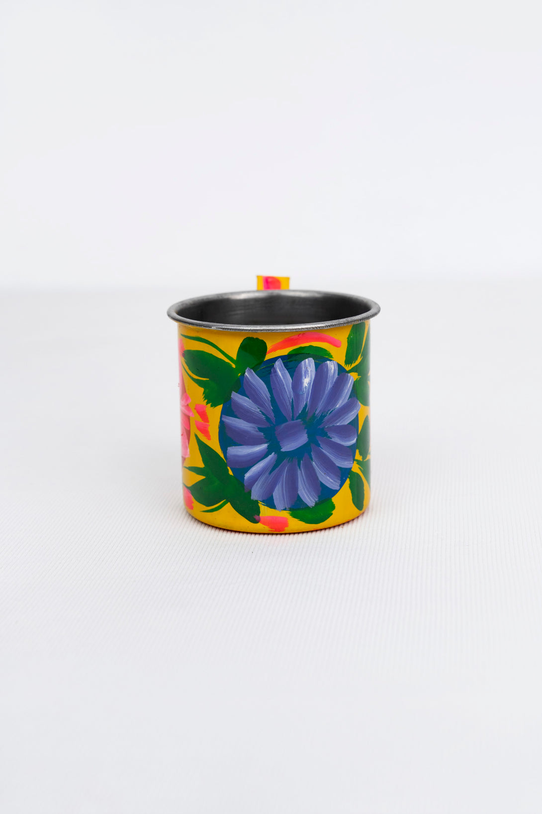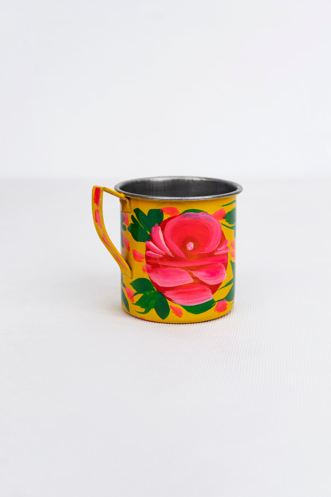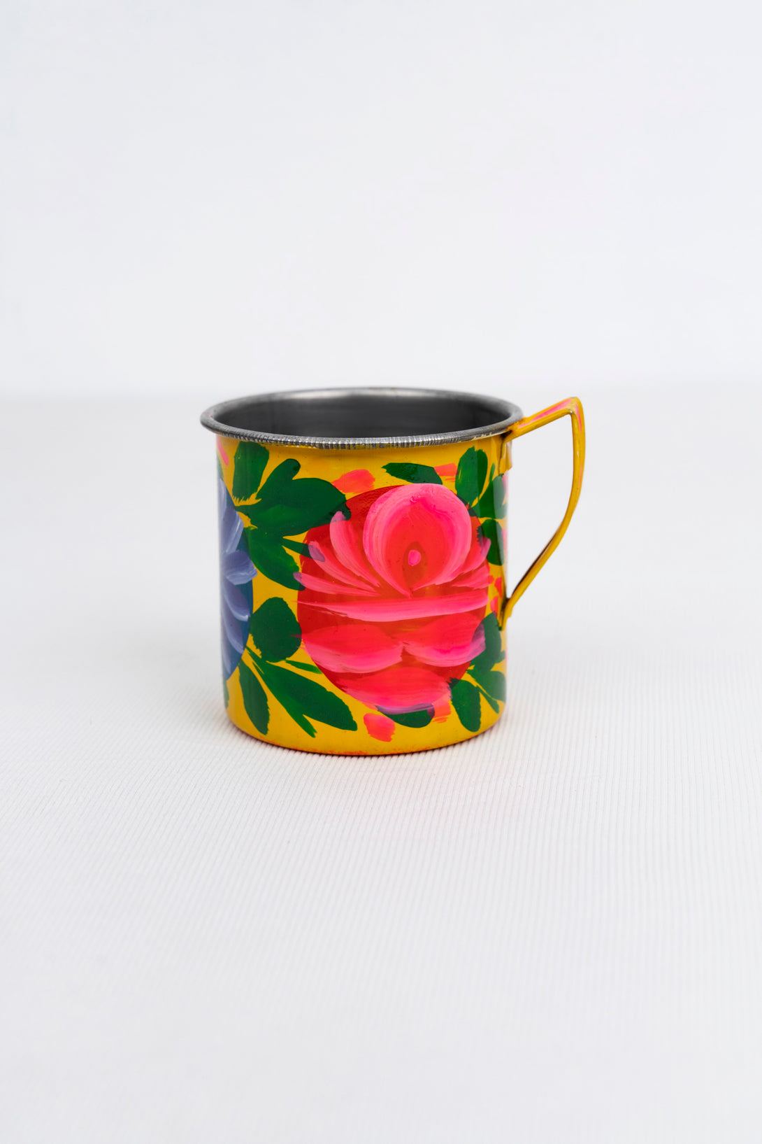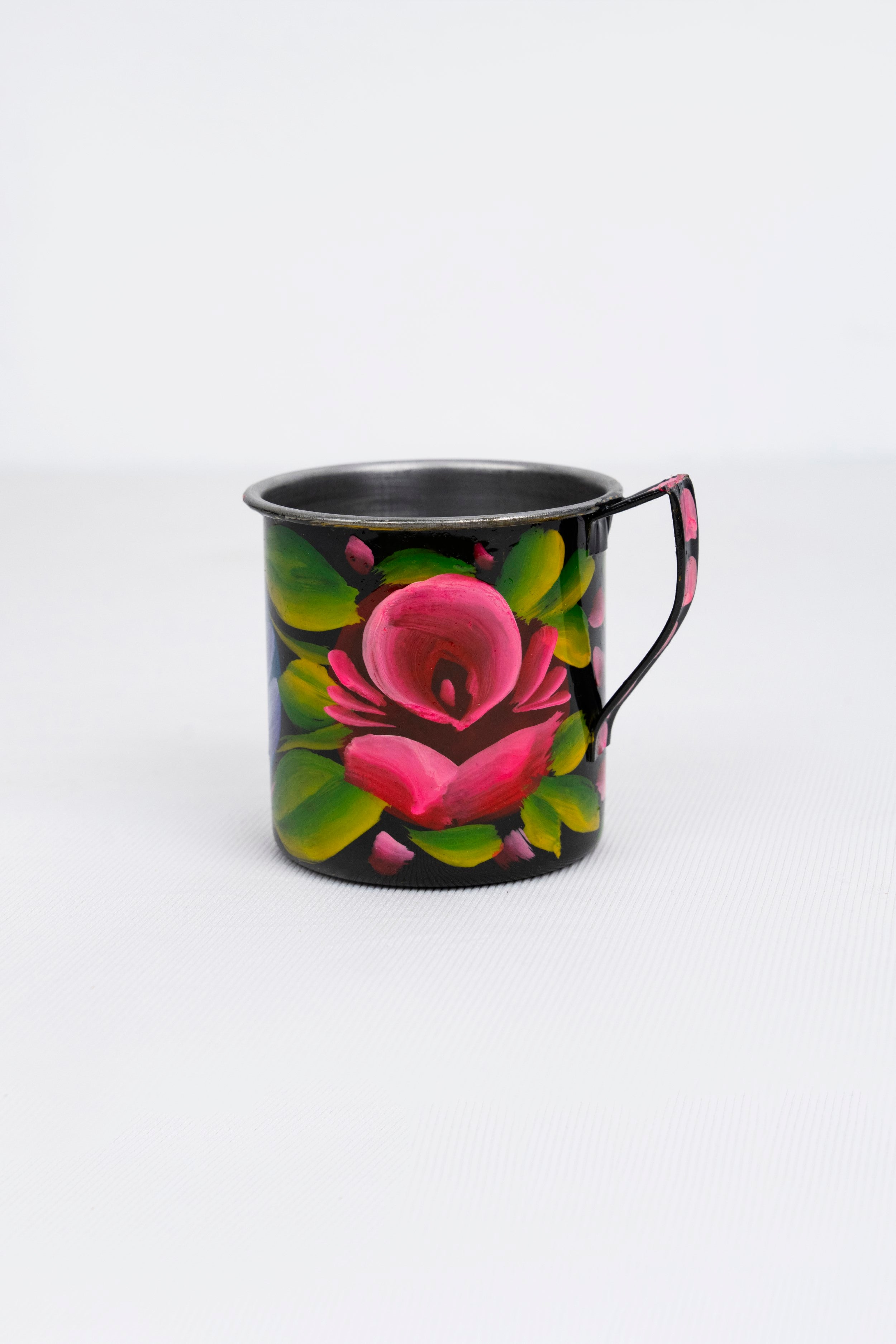 Add a burst of color and tradition to your home with these hand-painted metal mugs featuring vibrant floral designs. Inspired by South Asian truck art and folk aesthetics, each mug showcases a unique combination of bold colors and intricate flower patterns. With one featuring a handle and two without, they make for a charming mix-and-match set for décor or dry-use serving.